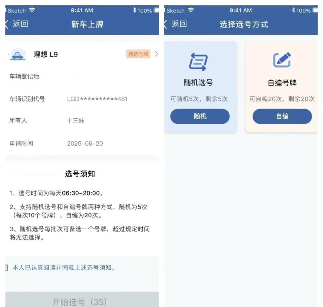 第六步:申请信息确认成功后,进入选号环节,符合使用原号情形的,可选择使用原号,不符合可使用原号情形的请仔细阅读选号须知,选择选号方式,确认心仪号牌号码。