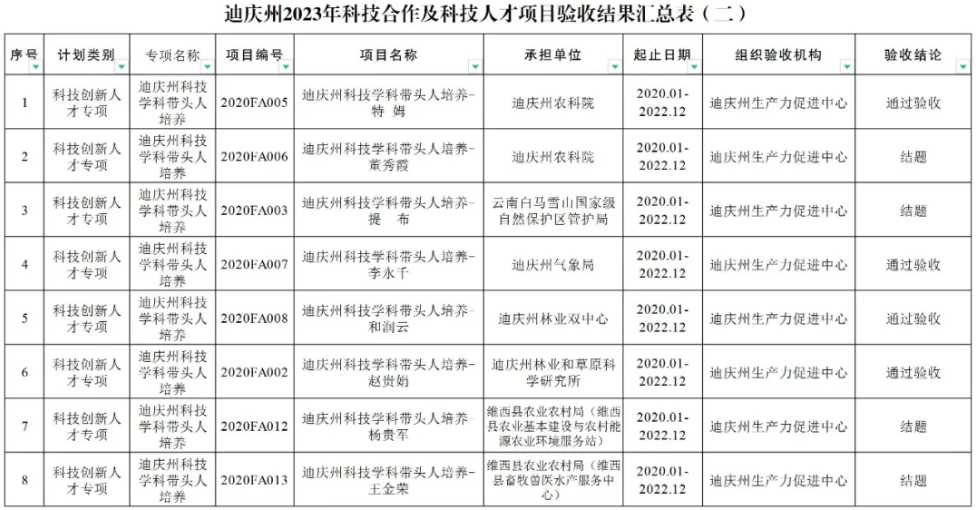 为进一步加强迪庆州科技计划项目验收管理,迪庆州科技局组织对实施到期的16个科技合作及科技人才项目进行了验收。现将验收结果予以公示,自本通知印发之日起,公示5个工作日。公示无异议的,迪庆州科技局将对通过验收的项目印发验收通过通知。