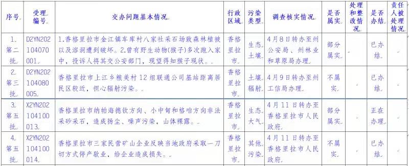 截止2021年4月20日,云南省迎接中央生态环境保护督察工作领导小组边督边改组交办中央第八生态环境保护督察组(以下简称“督察组”)涉及迪庆州群众举报投诉生态环境问题共14件(来电5件、来信9件),涉及香格里拉市7件、维西县2件、州级部门5件。