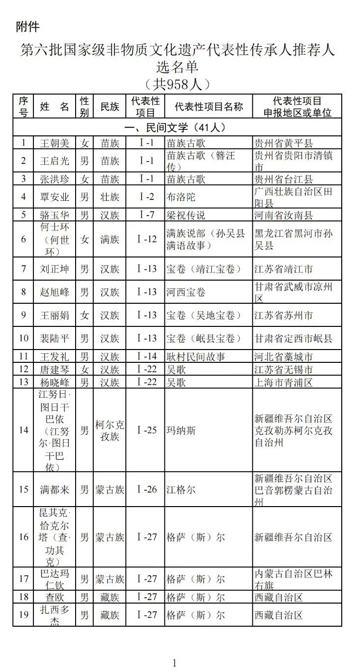 在全国31个省、自治区、直辖市和新疆生产建设兵团,香港特别行政区、澳门特别行政区,以及中央和国家机关有关部门推荐申报的基础上,文化和旅游部成立评审委员会,组建评审专家组,经材料复核、专家初评、申报人答辩、评审委员会审议,提出第六批国家级非物质文化遗产代表性传承人推荐人选名单(共958人),现予以公示。