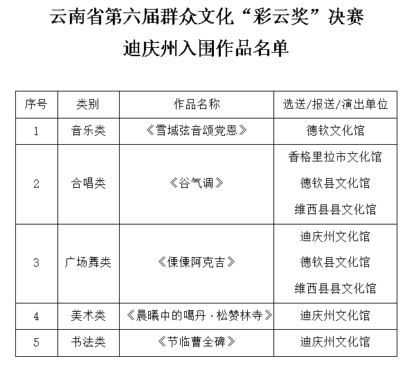 迪庆州文化馆一直致力于推动群众文化的发展,注重培养和挖掘文化人才,积极搭建文化交流与展示的平台。此次在云南省第六届群众文化“彩云奖”中的优异成绩,是迪庆群众文化发展成果的一次集中展示,同时在“彩云奖”展演期间参加了开幕式和闭幕式以及在城区广场惠民演出展演展示。通过与全省群文系列交流与相互学习激励着我州在未来继续加强群众文化建设,不断推出更多优秀的文化作品,为丰富群众文化生活、推动文化事业繁荣发展贡献力量。相信在未来的群众文化舞台上,迪庆州将继续大放异彩,书写更加绚烂的文化篇章,让群众文化之花在这片土地上绽放得更加绚烂多姿!