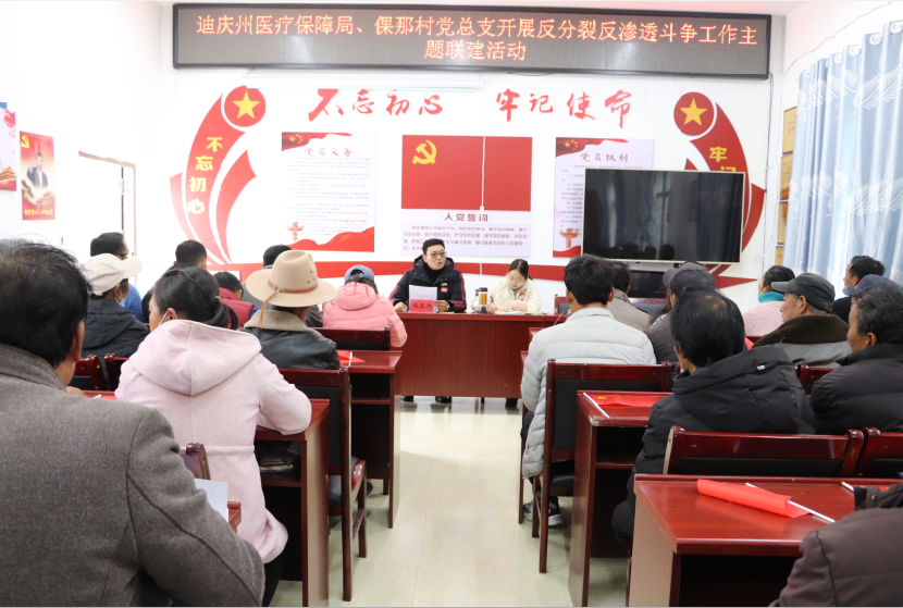 讲授专题党课。为进一步学习领会习近平新时代中国特色社会主义思想,认真学习领会“七座会”精神特别是习近平总书记重要讲话精神,深化对总书记西藏工作重要论述、治边稳藏战略思想和新时代党的治藏方略的理解把握,扎实开展好反分裂斗争,旗帜鲜明、针锋相对、主动治理、强基固本,州医保局党组成员、副局长冯玉兵同志为维西县叶枝镇倮那村党员干部讲授“开展好反分裂斗争、维护社会长治久安”专题党课。