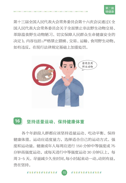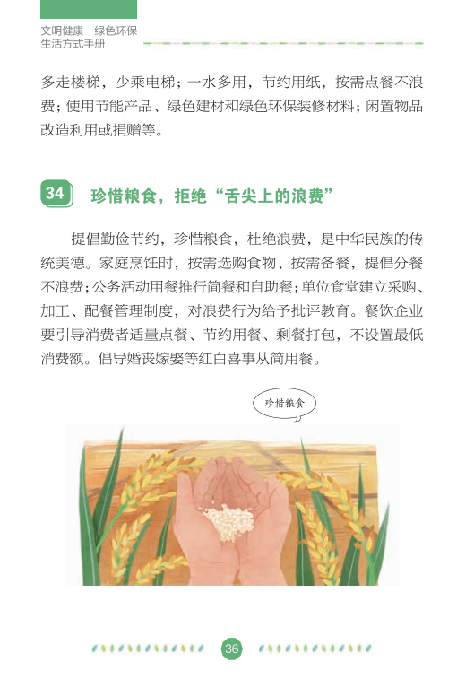 今年4月是第35个爱国卫生月。在全国爱卫办、中央文明办、健康中国行动推进办的指导下,中国健康教育中心组织专家编写了《文明健康绿色环保生活方式手册》,分别从讲文明、铸健康、守绿色、重环保4个角度,向公众介绍如何在日常生活、工作和学习中积极践行文明健康、绿色环保的生活方式,切实增强公众的节约意识、环保意识和生态意识,维护自己和家人的健康,实现可持续发展。