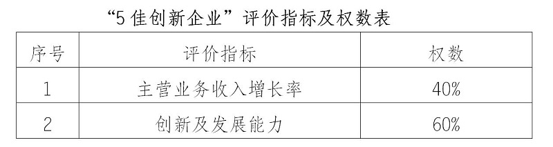 依据评价指标及权数表,进行指标细化及分值量化,作为"5佳创新企业”评分依据。