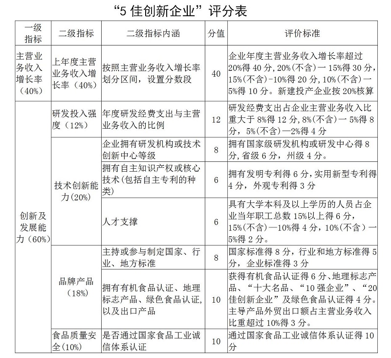 “5佳创新企业”采取自愿申报的方式,申报企业对照上表所列指标提供相应证明材料,由州工业和信息化局组织专家进行评审打分,按评审得分进行排序确定。