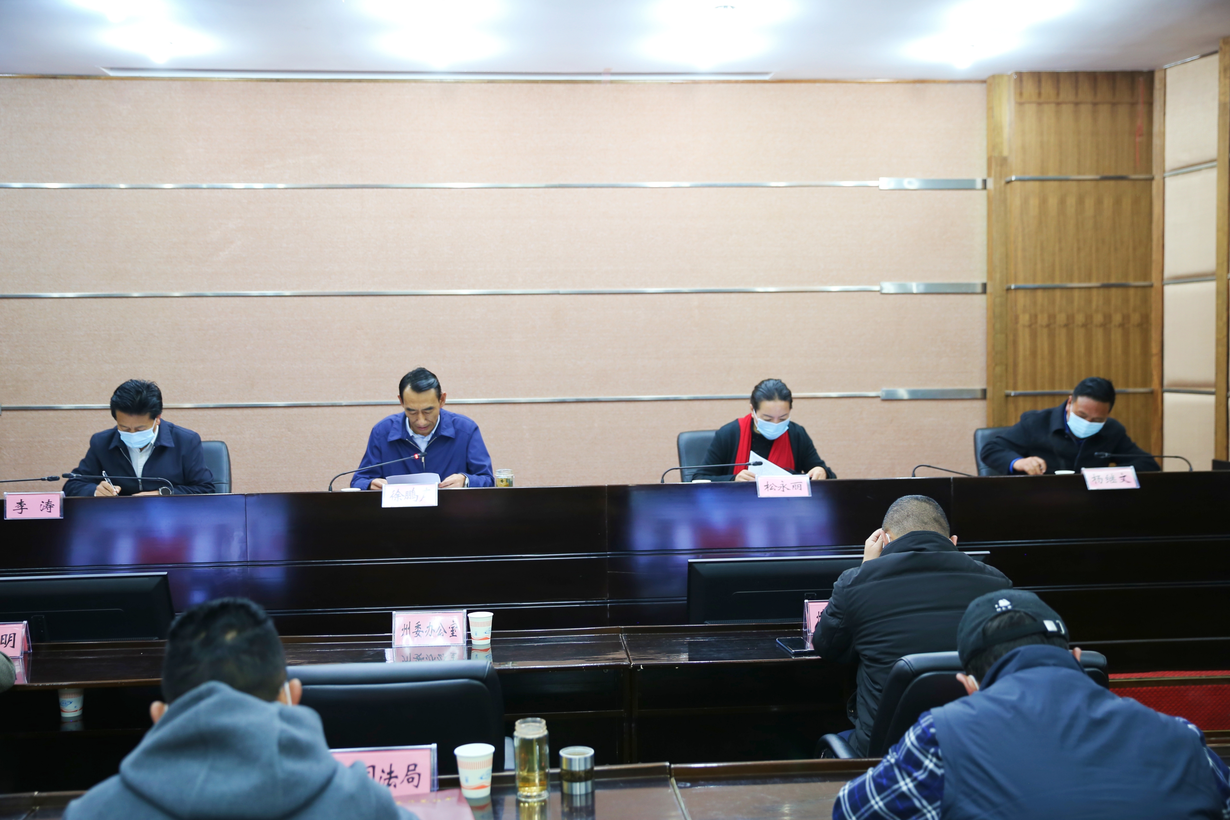 会议以视频形式开至各县市和乡镇。松永丽、李涛、杨继文等领导及州应对疫情工作领导小组指挥部各工作组、成员单位负责人在主会场参加会议。