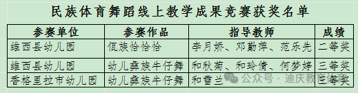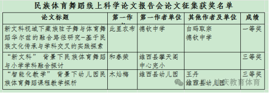 本次活动紧扣铸牢中华民族共同体意识主线,我州教师积极参与,在民族体育舞蹈线上教学成果竞赛、民族体育舞蹈线上科学论文征集两项活动中表现优异。获奖教师将民族文化传承、体育美育教学与民族团结教育深度融合,实现了教学实践创新与教育科研成果双提升,为我州相关教育工作开展提供了宝贵经验。获奖名单如下:
