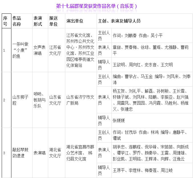23日晚,文化部公布了第十七届群星奖获奖作品名单,维西县文化馆创作演出的原生态无伴奏混声小合唱《瓦器器》荣获音乐类群星奖。公示时间为10月23日至29日,颁奖仪式将于29日晚在陕西易俗大剧院举行。