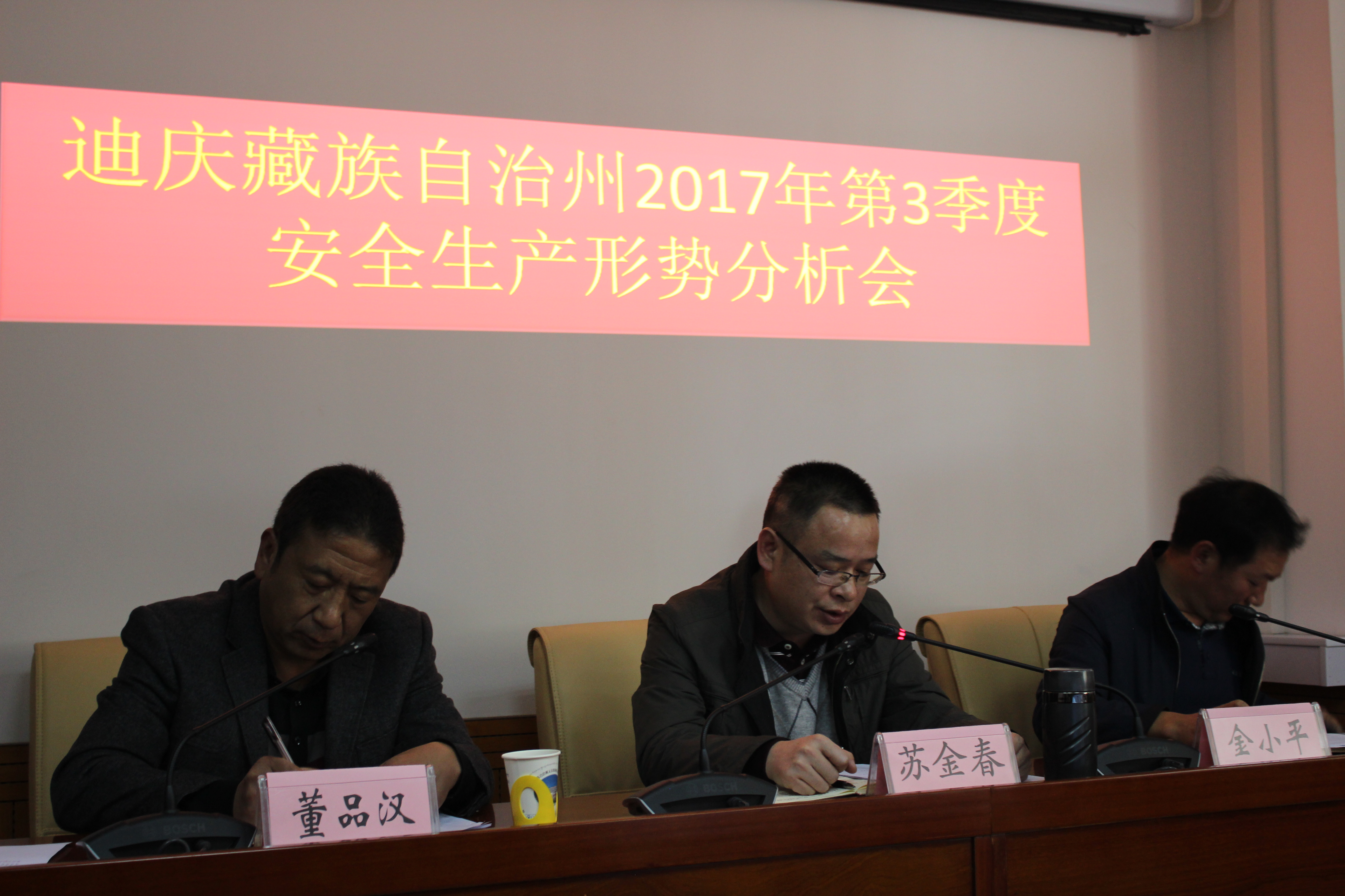 为加强岁末年初全州安全生产工作,坚决防范和遏制各类事故发生。2017年11月6日,州人民政府组织召开全州三季度安全生产形势分析会议。会议以视频会形式召开,县市、区设分会场。州委常委、副州长苏金春同志出席会议并讲话,会议由州政府副秘书长金小平同志主持。州县市安委会成员单位和有关重点企业负责人分别在主会场和分会场参加了会议。